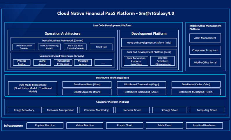 Cloud Native Financial PaaS Platform Sm@rt Galaxy4.0 provides the clients with complete financial-grade cloud-native and distributed PaaS capabilities, including: underlying cloud native and distributed technology base, low-code development platform for finance industry, as well as middle office management platform that provides complete ecological support for the construction of middle offices, so as to form a complete system of operation, maintenance, development and management, to empower the digital transformation of the finance industry.